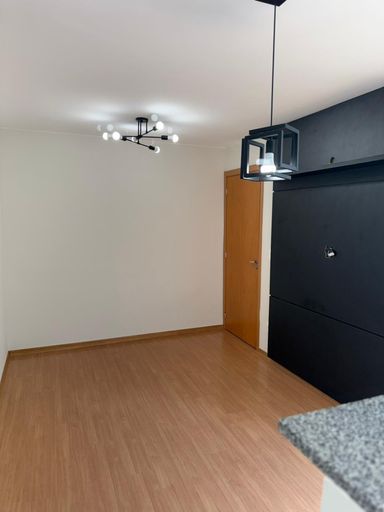 Sala dois ambientes com painel de TV;
