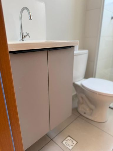 Banheiro social com gabinete de pia e box;