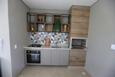 Cozinha americana com bastante espaço de armazenamento;