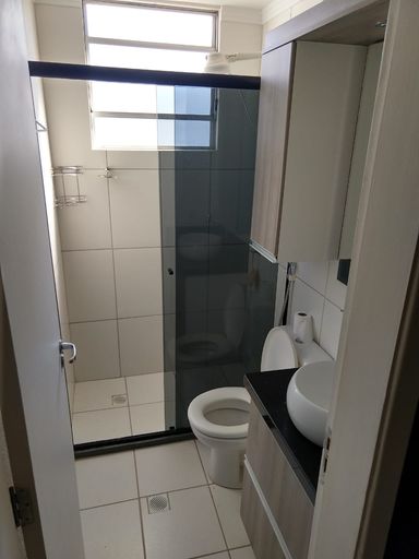 Banheiro social com gabinete social e box;