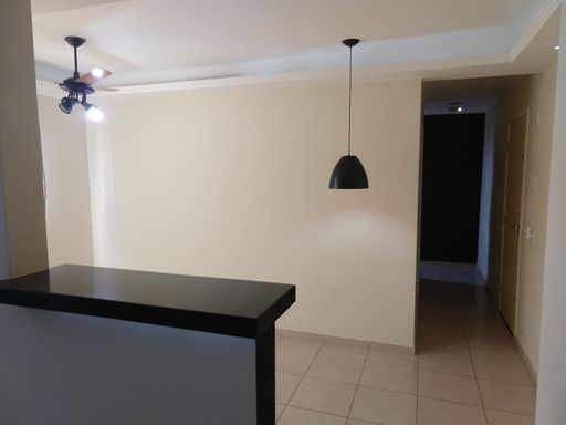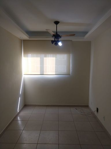 Sala dois ambientes com persianas e ventilador de teto;