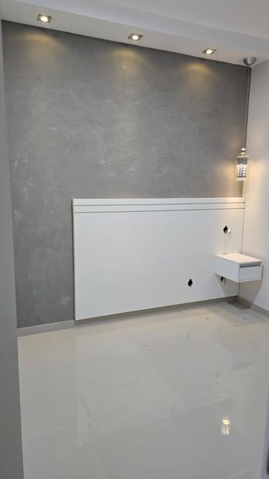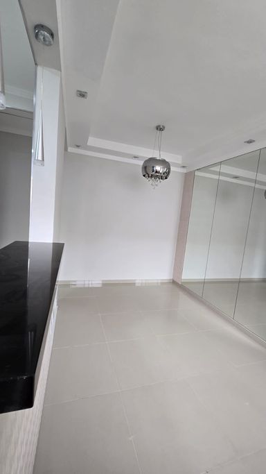 Sala dois ambientes com lustre, acabamento em gesso e spots embutidos;