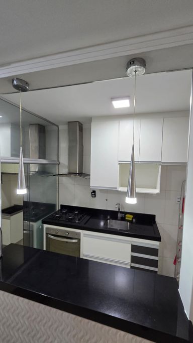 Cozinha americana com bastante espaço de armazenamento, cooktop, forno e depurador;