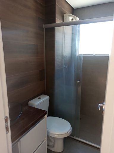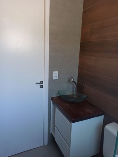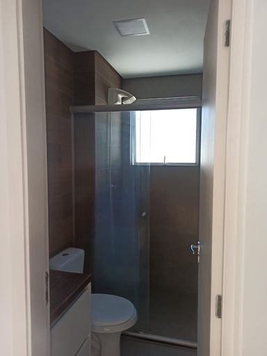 Banheiro social todo em porcelanato com gabinete de pia e box;