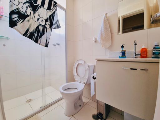Banheiro social com gabinete de pia e box;