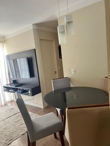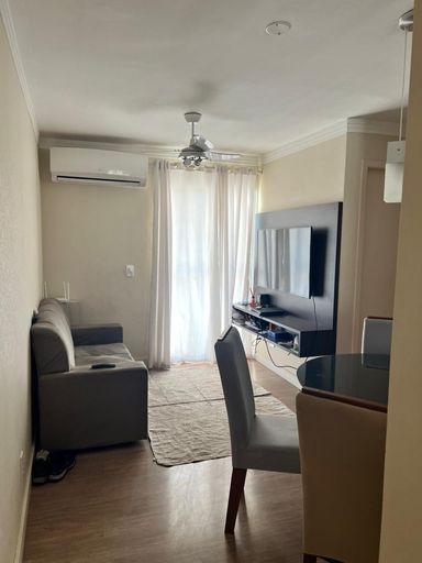 Sala dois ambientes com iluminação natural vinda da sacada;