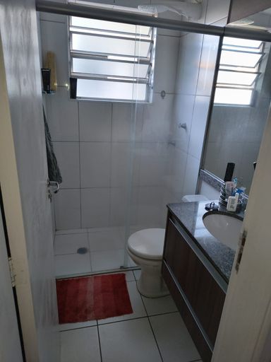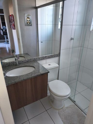 Banheiro social com gabinete de pia e box;