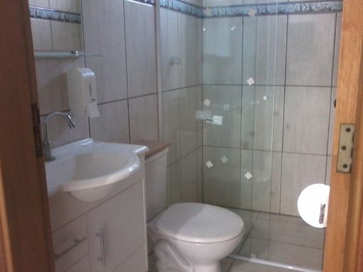 Banheiro social com gabinete de pia e box;