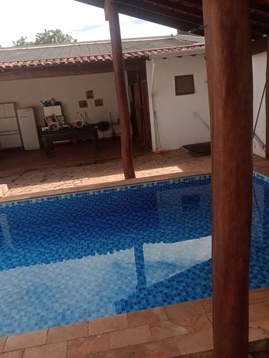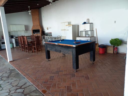 Área de lazer completa com churrasqueira em alvenaria com giragrill para 5 espetos, armários, piscina de 7,0x3,5m com aquecedor solar, prainha, ducha e banheiro externo;
