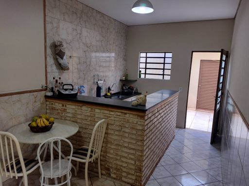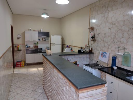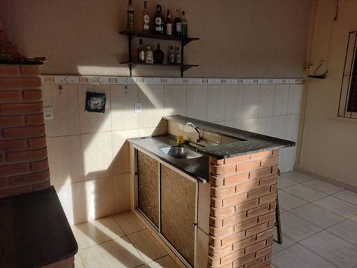 Cozinha ampla com o charme rústico de uma bancada de tijolinhos e gabinete de pia;