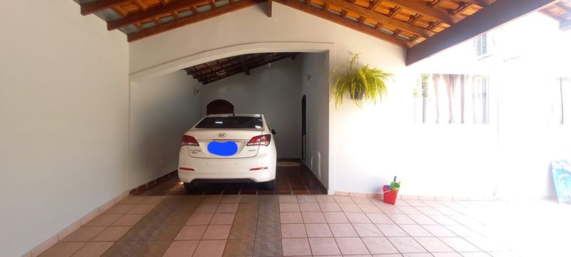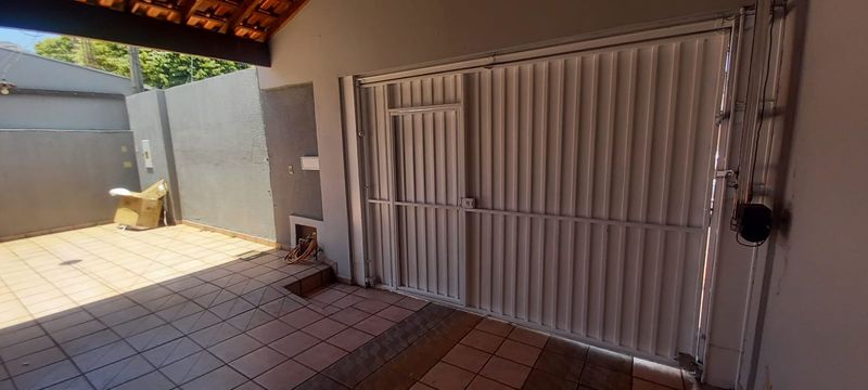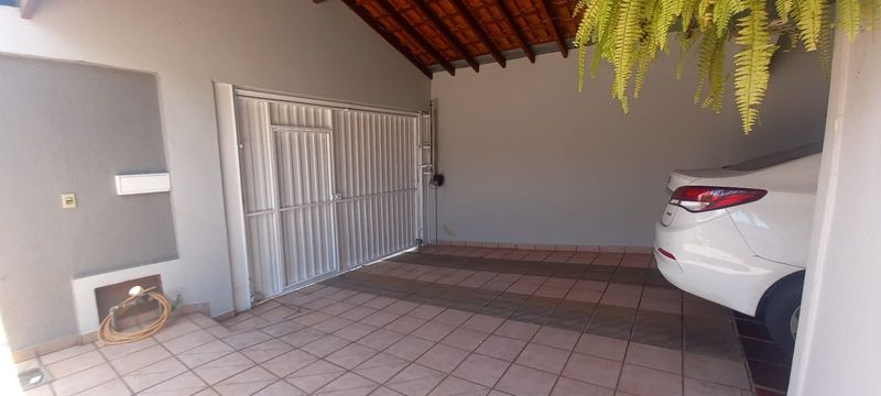 03 vagas de garagem cobertas com portão fechado e muros altos.