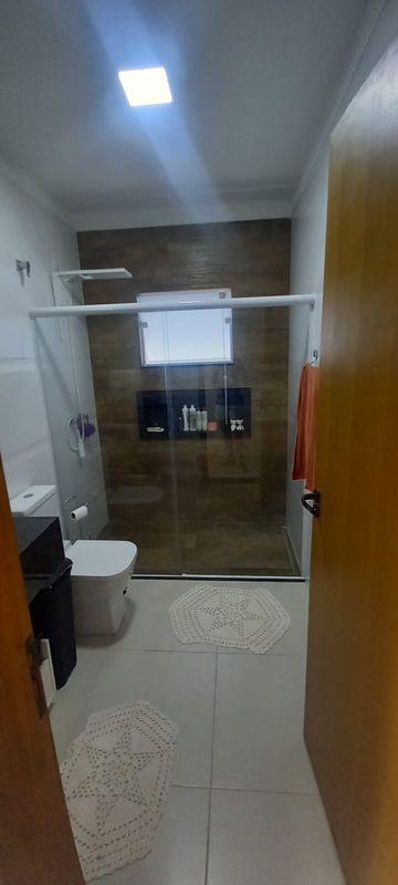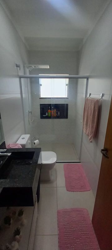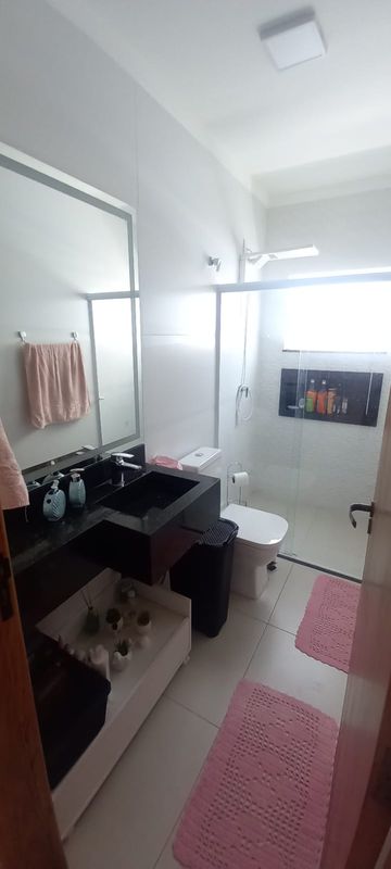 Banheiro social com pia diferenciada, espelho, nicho e box;