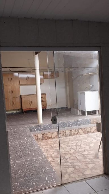Cozinha ampla com iluminação natural vinda de portas de vidro;
