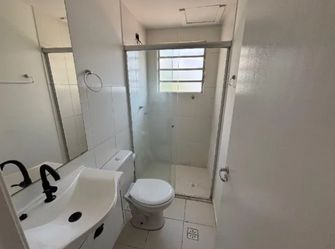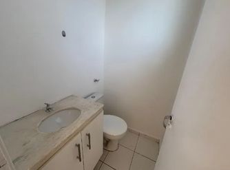 Banheiro social com gabinete de pia e box;